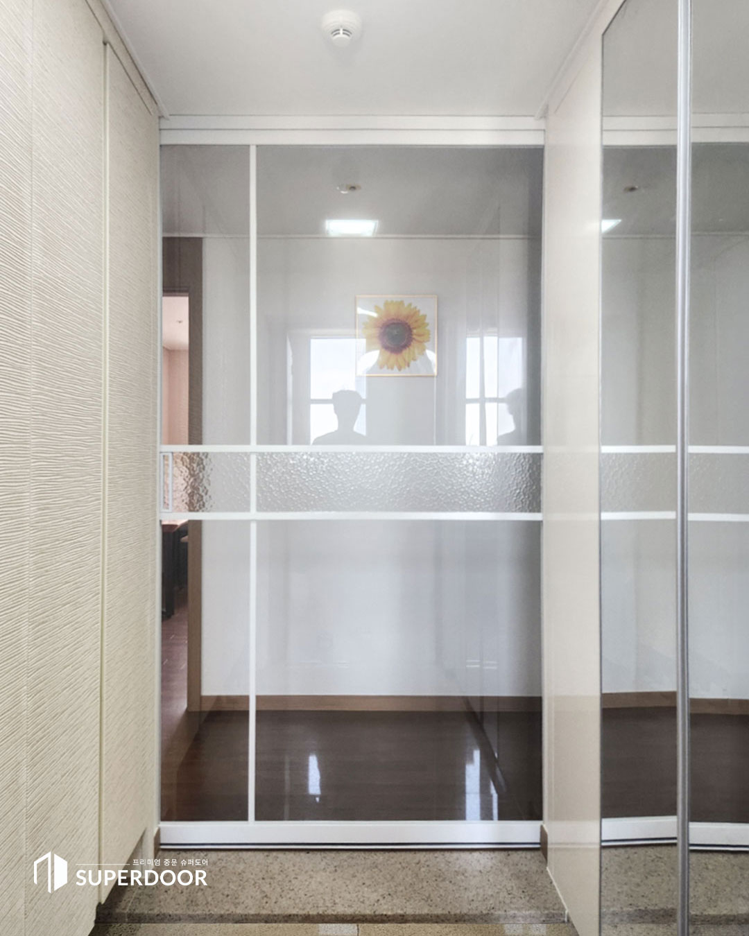 중문 인테리어 / 슈퍼도어 원슬라이딩 중문 현관 인테리어 시공사례 원슬라이딩 / 화이트 / 분할형 / 투명+모루 / 현관설치 / 파주 푸르지오파르세나 대기업 납품 프리미엄 중문 인테리어 브랜드